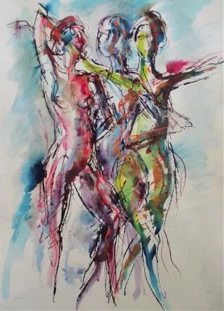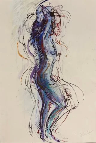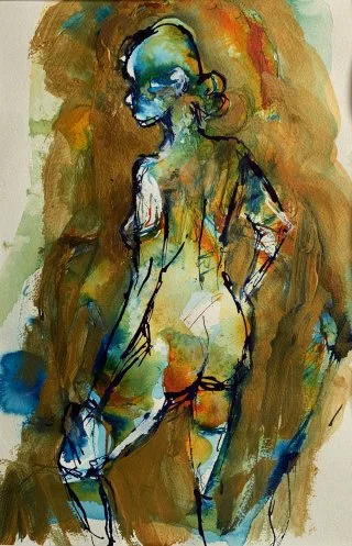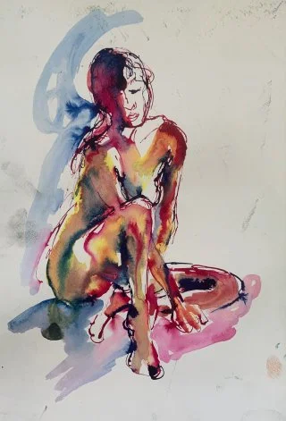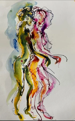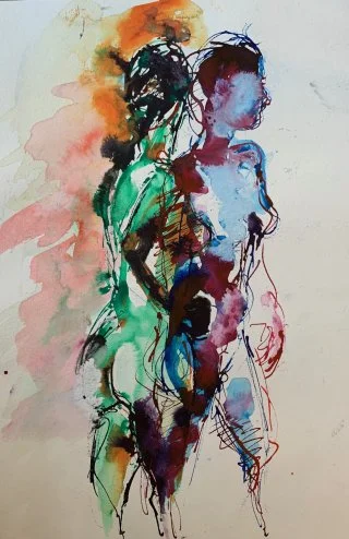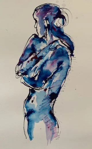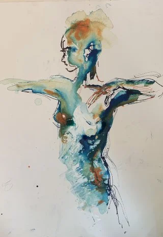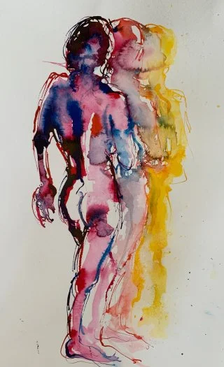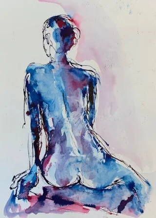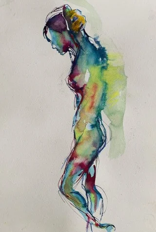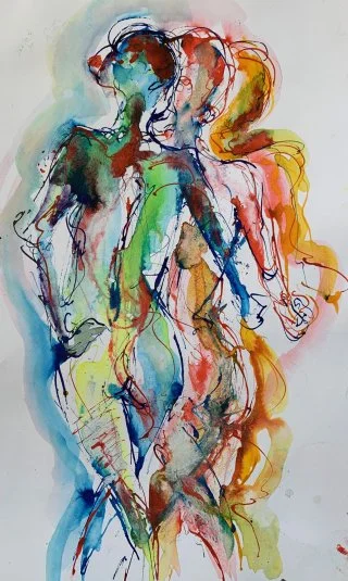 My observational drawings are all from life, using a pipette to apply the liquid watercolour and then wash over with a brush to allow the colours to run. I love drawing one figure over another - which produces interesting and beautiful results as the figures and colours merge into each other.